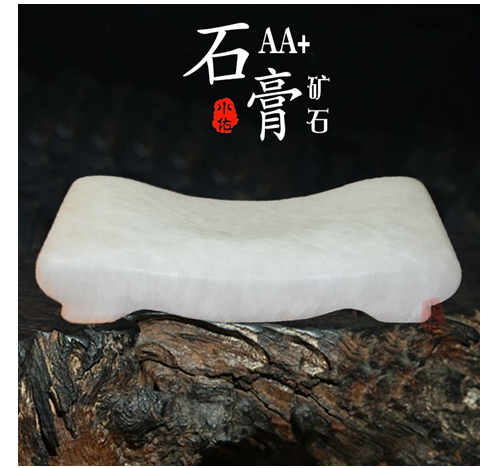 原矿石膏储存于地下的天然矿石,古称“蒲阳玉”,药名寒水石。明朝李时珍《本草纲目》第九卷记载“石膏亦称细理石,又名寒水石,其性大寒,主治中风寒热,有解肌发汗,除口干舌焦,头痛牙疼等功能,乃袪瘟解热之良药”。《现代中草药手册》和《中国医药大词典》认为:寒水石用于失眠、高血压、内热、目赤、头疼、颈椎痛等症状的治疗有极好的效果。